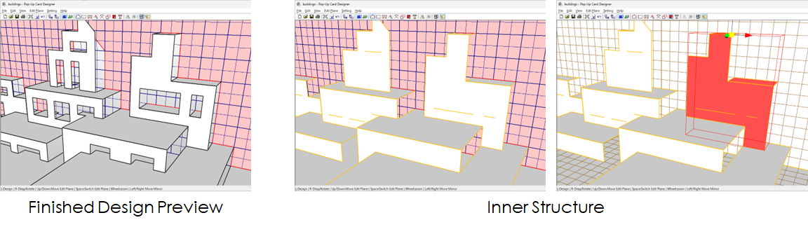 When you start Pop-Up Card Designer, a card opened at a right angle appears. You can change the view by dragging with the right mouse button. You can zoom in and out with the mouse wheel. Hold down the [Ctrl] key and right-drag the mouse (or mouse wheel drag) to translate the viewpoint.