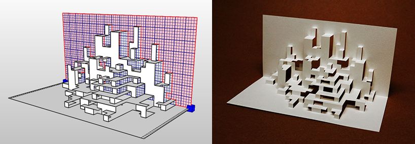 デザインに対応した型紙のデータは自動で計算されます。展開図を印刷したら、1枚の紙に切り込みと折り目を入れるだけで制作できます。