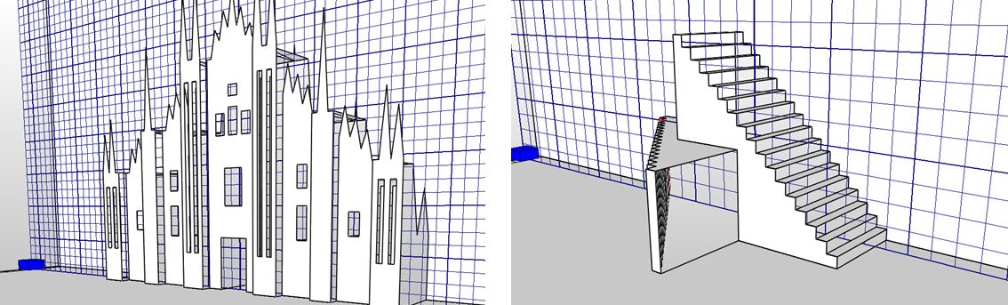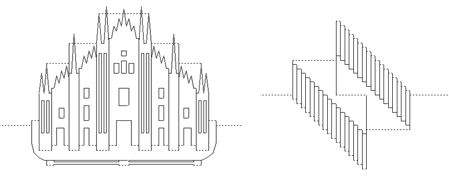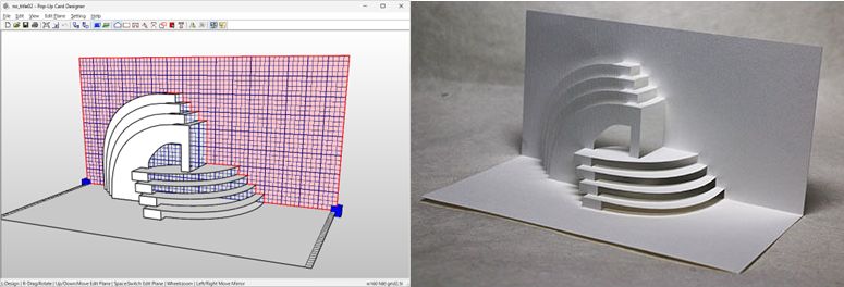 ポップアップカードデザイナーでデザインされるポップアップカードは必ず1枚の紙から作成できる形なので、実際の工作は切込みを入れて折り曲げるだけで完成します(このようなポップアップカードは「折り紙建築」とも呼ばれています)。 ソフトウェが自動的に形の計算を行って、常に1枚の紙から作成できる形を保証してくれます。